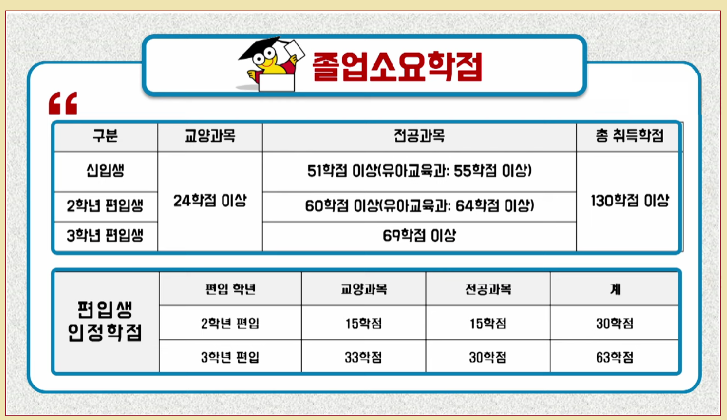 교양과목은 24학점 이상, 전공과목은 69학점 이상 들어야 하는 세부조건이 있다.