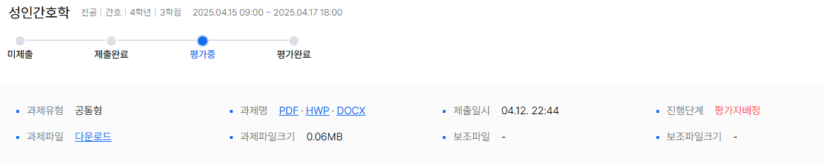| [간호사의 편입생 생활] 중간 과제 (4) 과제물 제출 확인 (0) | 2025.06.09 |