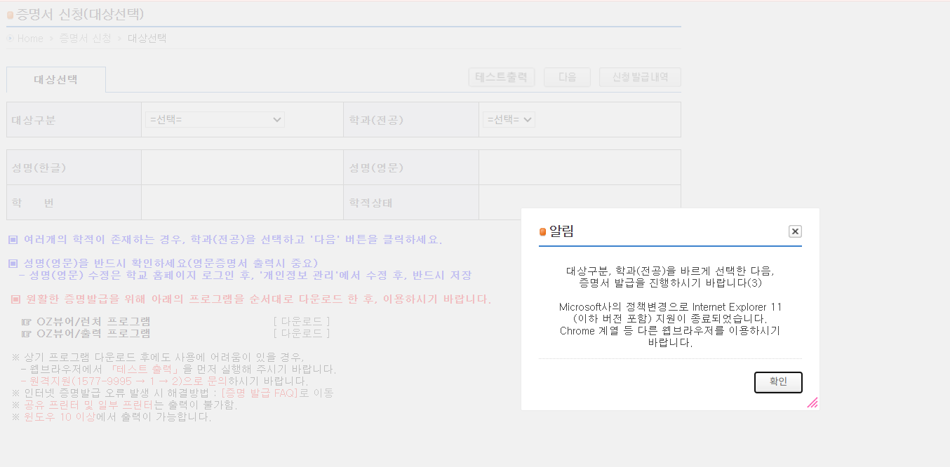 좌측 카테고리의 [증명 발급]-[증명서 신청/발급]을 누르면 새로운 창이 뜬다.