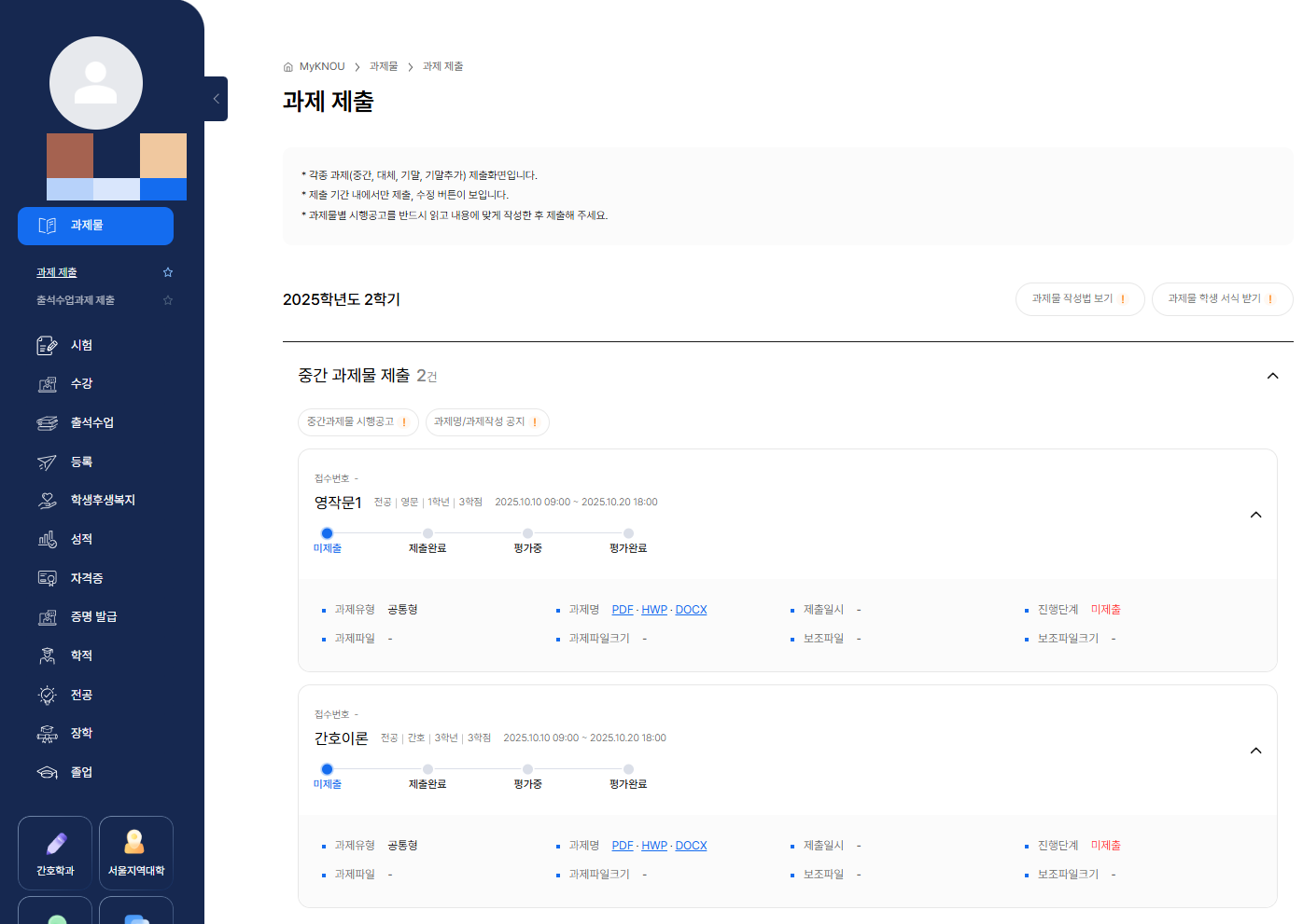 이번에 수강한 과목들 중에 과제물 제출해야하는 과목은 두 과목뿐이다.