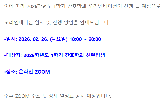 ◎2026학년도 1학기 간호학과 오리엔테이션 안내(ZOOM주소 및 일정표 추가)◎