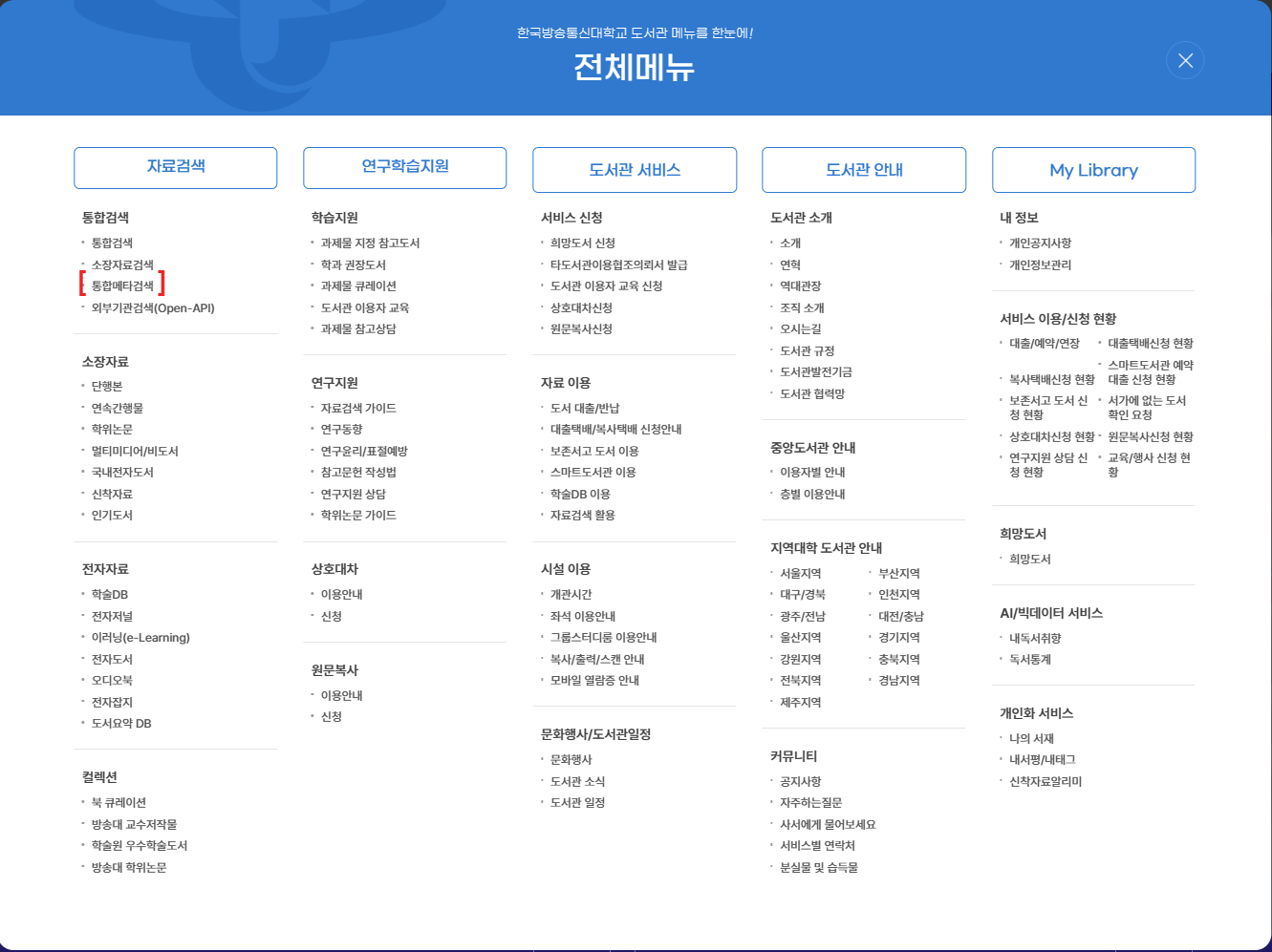[전체메뉴]에서 가장 좌측 카테고리에 있는 [자료검색]